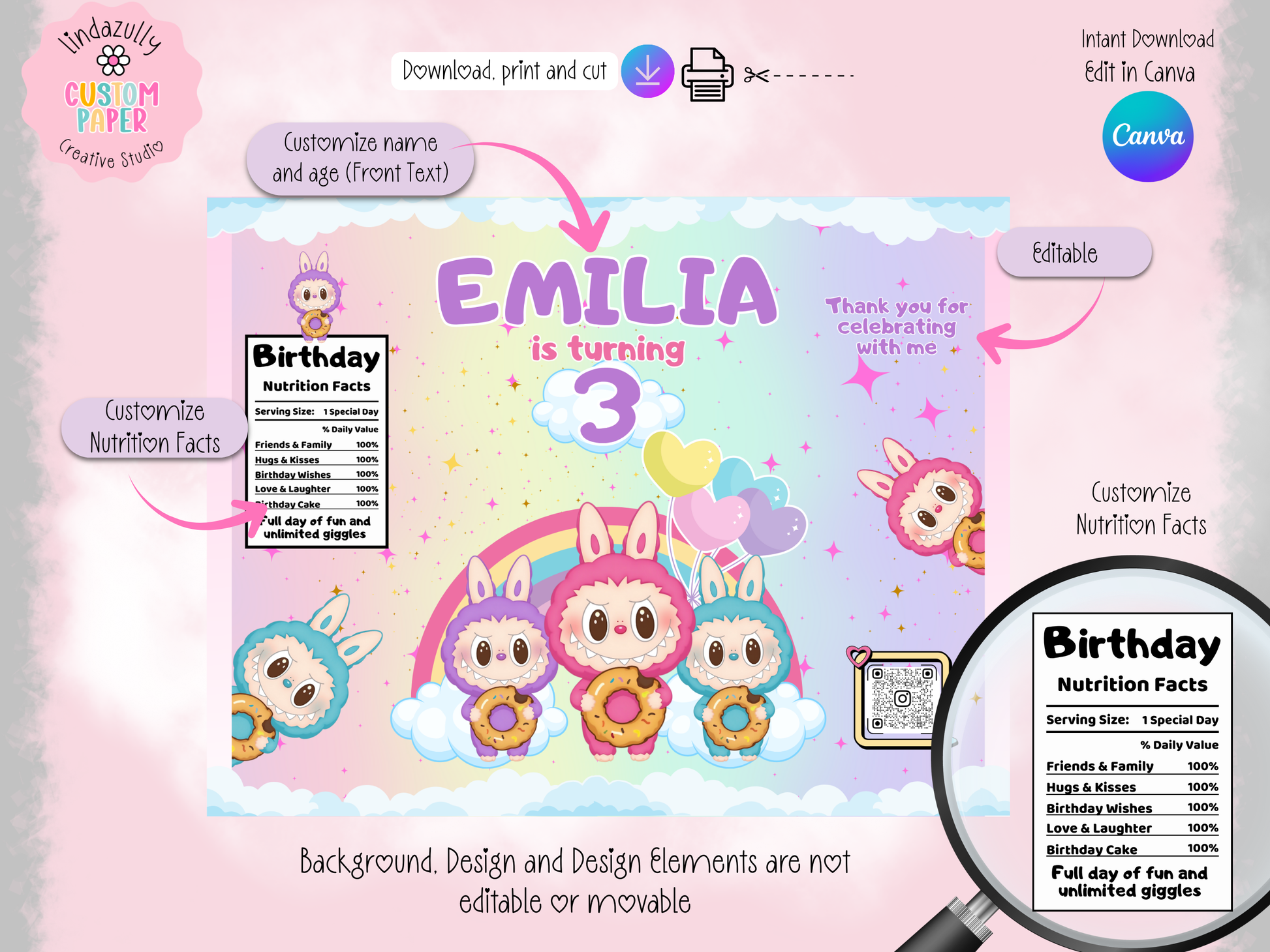 Make your little one's day extra special with this Labubu- inspired printable labels. These are Canva customizable template where you can personalize the name and age easily.